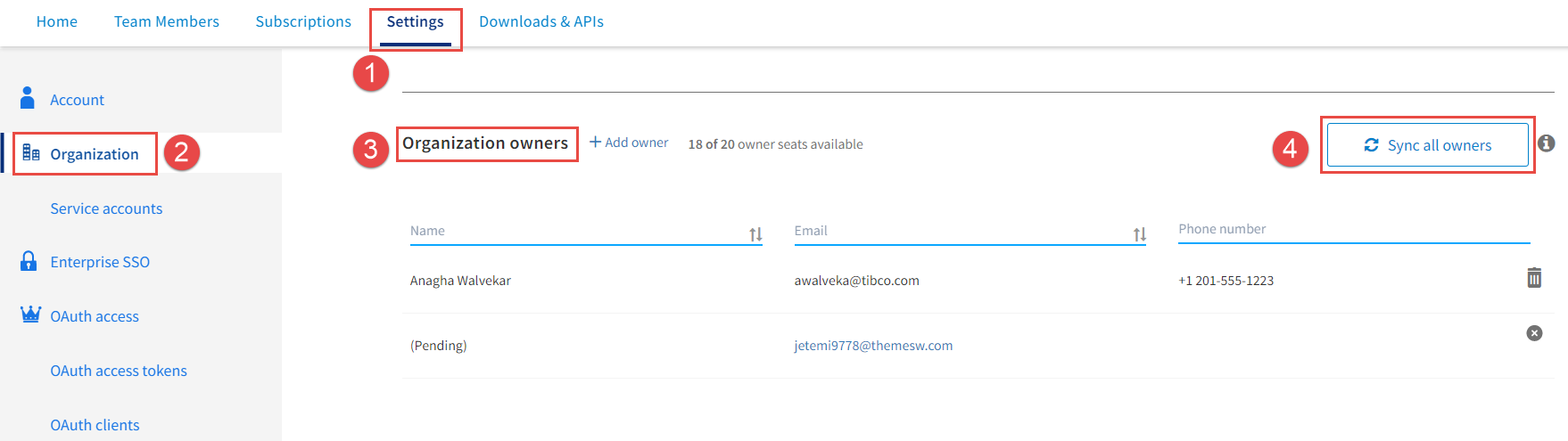 To add an owner to existing child organizations, navigate to Settings > Organization > Organization settings and in the Organization owners section, click the Sync all owners button.