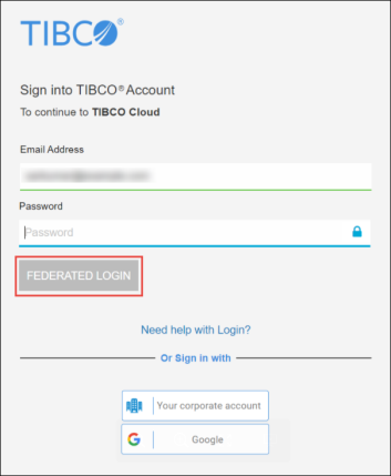 When an LDAP connection is configured and enabled for a domain such as example.com, all its registered users can sign in to TIBCO Cloud by providing their email ID and LDAP password and clicking the FEDERATED LOGIN button. Organization owners can still sign in using the password set up with TIBCO Account by clicking the TIBCO LOGIN button.