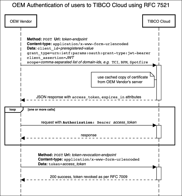 Organization owners might take over the authentication of their users when access is only via REST API and not a browser. Authentication is done by exchanging a JWT token signed by the organization owner for an OAuth Access Token to TIBCO Cloud, see RFC 7521. Such a solution is suitable for an OEM setup. The following diagram shows the protocol: