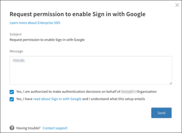 The Request permission to enable Sign in with Google dialog is displayed. Enter all the necessary information and click Send.