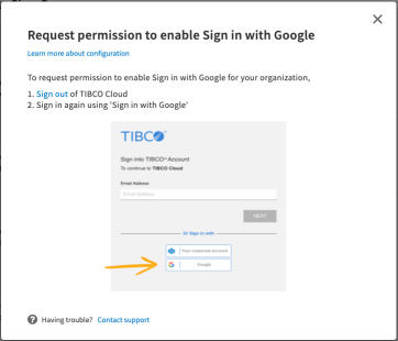 As an organization owner, you must be able to sign in to TIBCO Cloud successfully by clicking Sign in with Google.