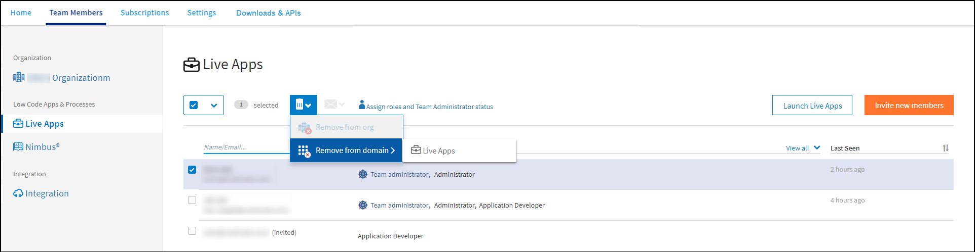 You can remove members from your organization or a domain capability to which you have subscribed. If you have reached the maximum number of members than the seats you have subscribed for a domain capability, you can remove an unwanted member and invite another member.
