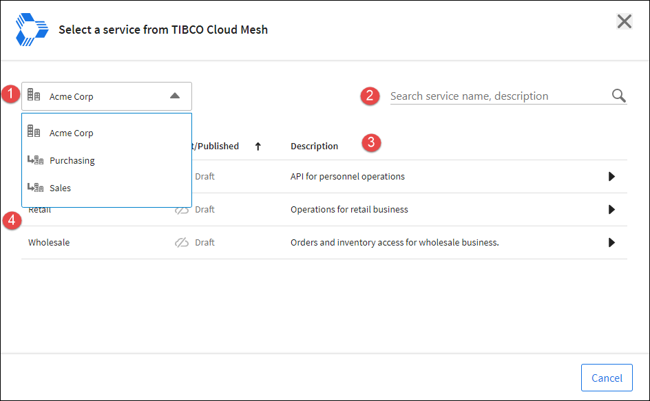 For some TIBCO Cloud domain capabilities participating as consumers of TIBCO Cloud Mesh: Services, the experience launches a TIBCO Cloud Mesh: Services modal dialog for selecting services. Currently, in the TIBCO Cloud Mesh: Services dialog you can select a single service and an endpoint path within that service.