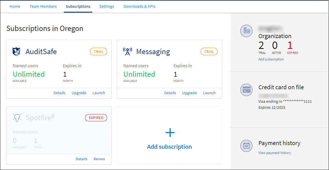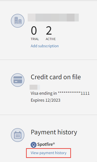 Note: Your credit card information is displayed only if you have previously used your credit card to make a subscription payment for TIBCO Cloud.