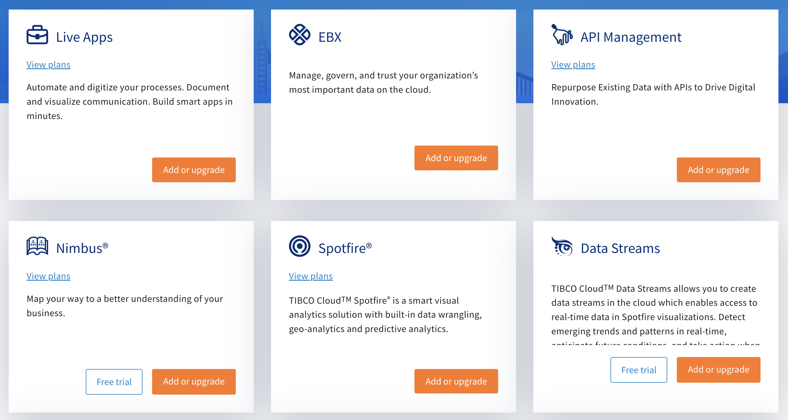 If you have received a link to TIBCO Cloud about working with domains such as Integration or APIs or if you visit cloud.tibco.com, you can either take a trial of a domain capability or purchase a subscription for the domain capability.