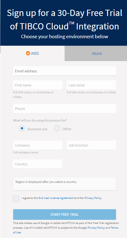 You might have received an offer of a 30-day trial of domains such as Integration, APIs, or Low Code Apps & Processes via email. When you click the link in this email, a sign-up form is displayed. Fill in the form and you can start the free trial.